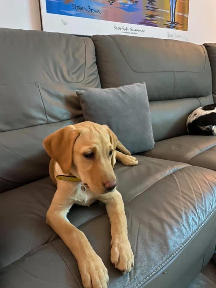The other dogs are cocker spaniels; Lucy is a Labrador. She is very sweet and good natured. The whole house is full of dog toys and she always carries one with her.
