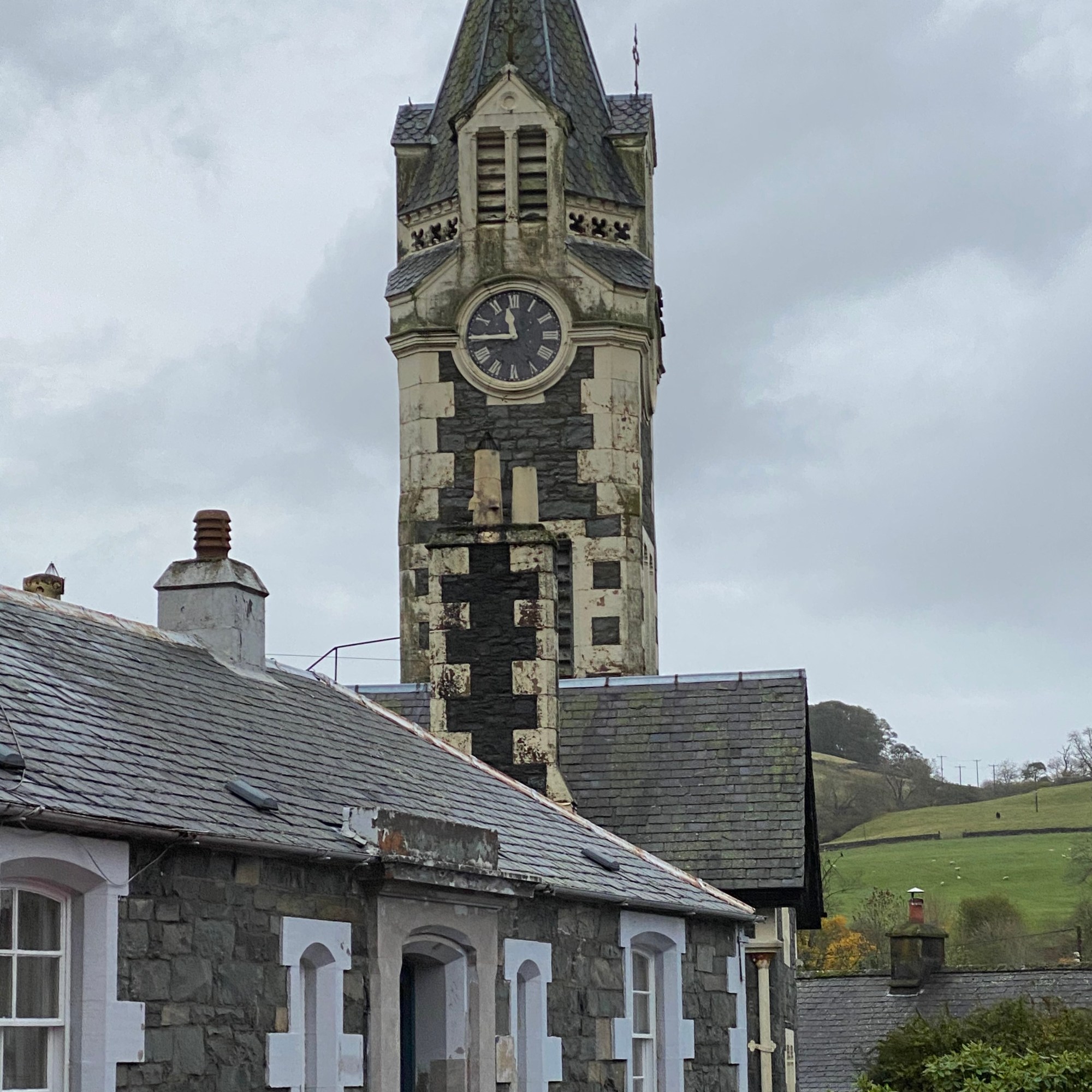 I set up my office in the attic. If it’s not raining, I can see a hill covered with white dots that are sheep. If I look to the right, I can see an old church and clock tower.