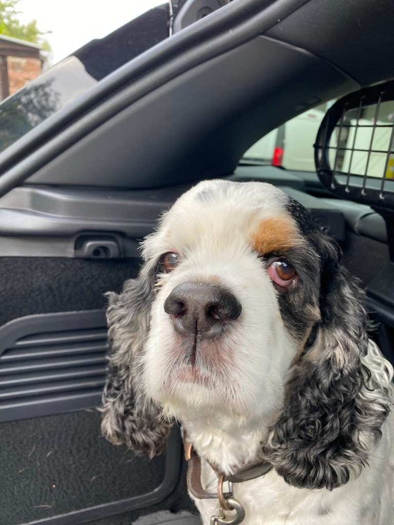 We went to see a house in a rural village called Moniave. More about that in another post. We left the dogs at their day care. We picked them up afterwards. Lucy and Ringo (a 4 year old cocker spaniel) were in the back seat together. Ringo was lying on the floor and Lucy on the seat.
