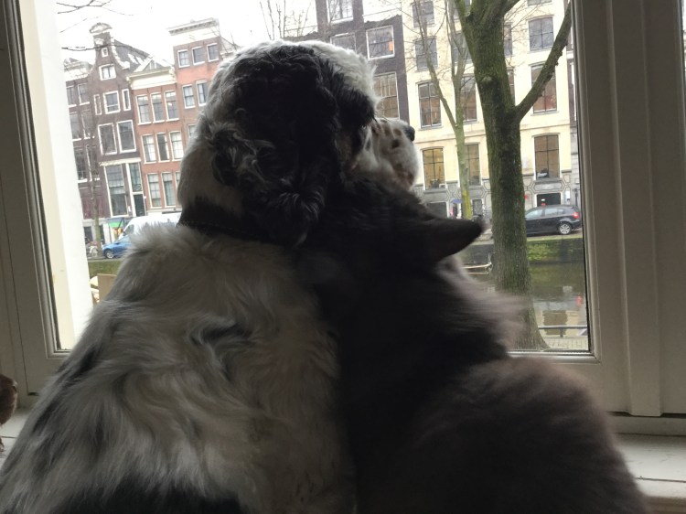 We have five cats (Bonnie, Nuntis, Squeaky, Missy, and Mable) and four dogs (Barney, Coco, Dakota, and Ringo). It was a lot of pets to have in a two bedroom apartment in the Red Light District when we lived in Amsterdam. The apartment had a small patio and no back yard, so we took them on constant walks. We also used a dog walking service. They would pick up the dogs once a week and take them to a field or to the beach to get exercise. They loved it, but of course they came back absolutely covered in mud.